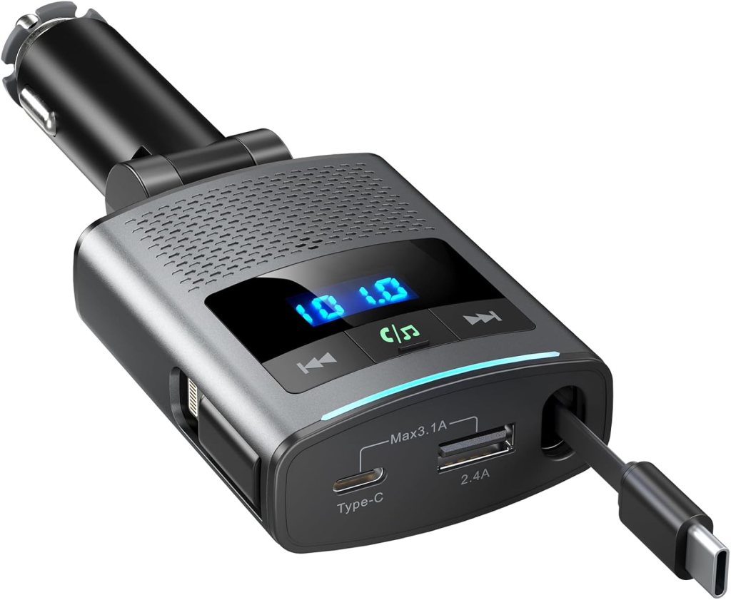 80.5W Bluetooth 5.3 Car Adapter with 35.4″ Retractable Charging Cable, 3 Fast Charging Ports [Type-C, USB A, Lightning Adapter], FM Radio Transmitter Hands-Free Calling, Gray